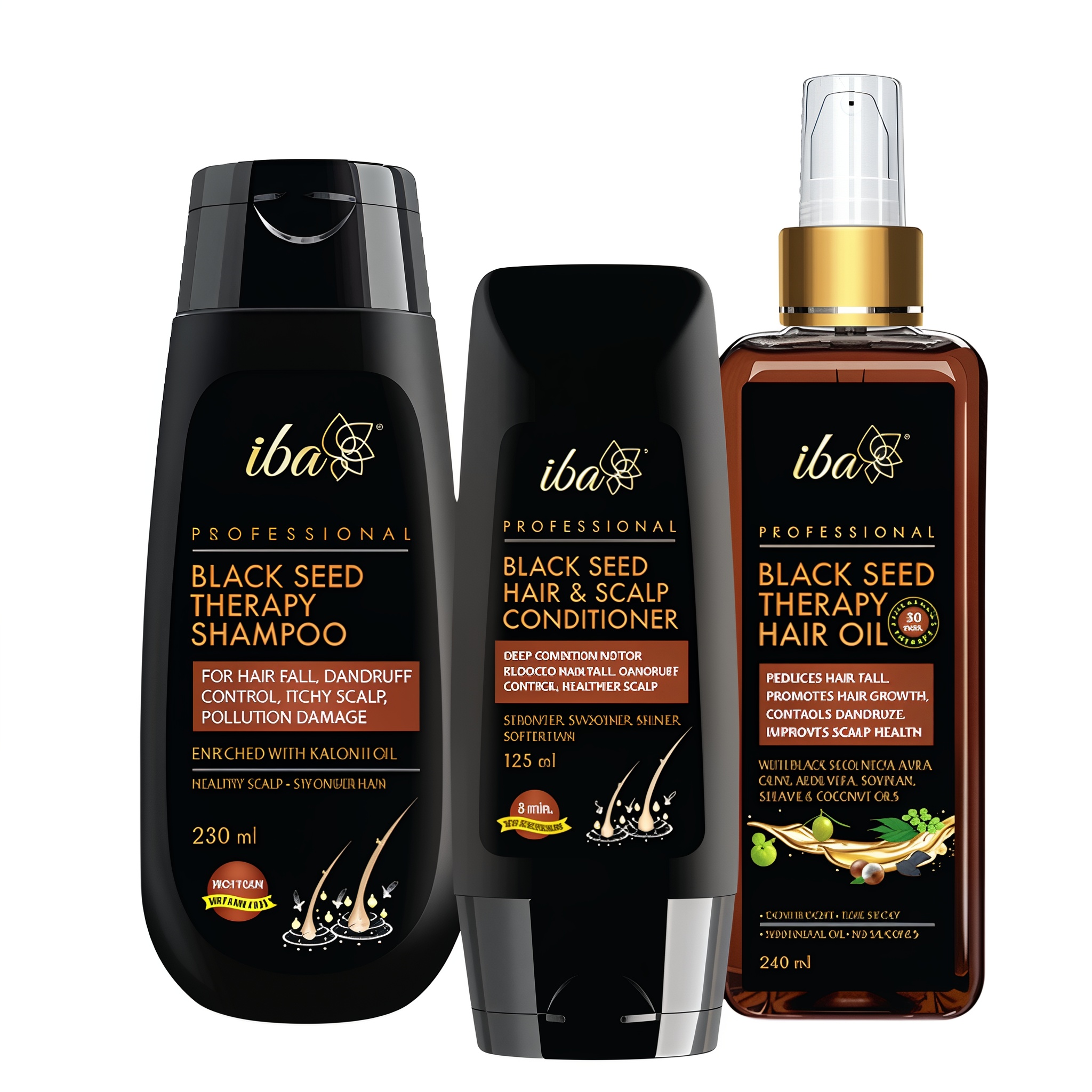 The Black Seed Therapy Hair Treatment Kit by IBA is a great choice for healthier and more beautiful hair. This IBA Kit is perfect if youāre dealing with hair fall, dandruff, or an itchy scalp. This Black Seed Therapy Hair Treatment Kit helps reduce hair fall, fight dandruff, and calm the scalp. After using it, your hair will feel smoother, softer, and shinier, with less frizz and easier to manage. The kit also has strong anti-bacterial and anti-fungal natural ingredients that keep your scalp clean and healthy. It also moisturizes the scalp to stop dryness and helps with premature greying. Use this kit regularly to make your hair look and feel vibrant and strong. Enjoy the healthy, nourished hair you deserve with the Black Seed Therapy Hair Treatment Kit by IBA.